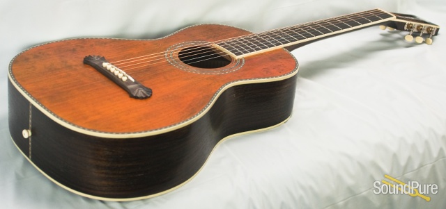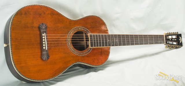 Killer vibe on this thing! Wonderful little parlor guitar with tone from the old, weird America. Great guitar for a period musician, or a songwriter looking for a comfortable accompanying instrument. The carved bridge is awesome!*