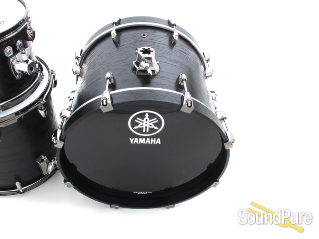This Yamaha Live Custom Black Wood set is here on consignment and is in good condition. It features the jazz sizes with an 18" bass drum, 12" rack tom, and a 14" floor tom. It will ship with the double tom holder and floor tom legs. The bass drum has one dimple on the player's perspective top left where the rack tom hoop fell. The finish has not been compromised, but there is a small dimple. The heads are relatively new-Evans G1 coated and Evans Emad coated. This set is a workhorse and will be a great player's set for someone.