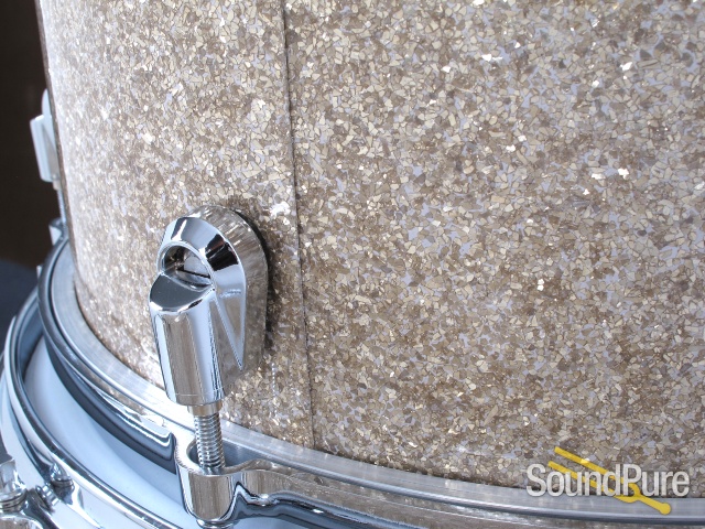 Originally a Jelly Bean that was purchased from a Yamaha dealer, these drums were sent to Precision Drum Company to be wrapped in Silver Glass Glitter. All of the seams are tight and an extra set of bass drum hoops are included with the set. The original Yamaha hoops have a black satin finish with the silver glass wrap and you will also receive the natural hoops shown in the photo. The natural hoops have a bass drum hoop protector which minimized pedal rash.
