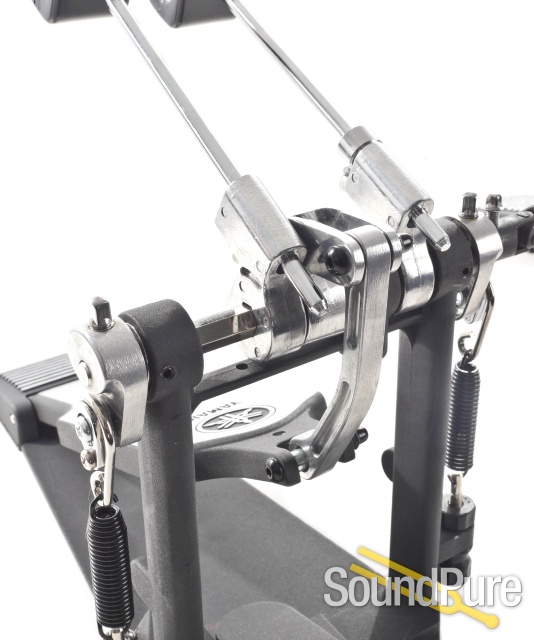 The DFP-9500D is a direct drive double pedal, with a solid cast link between the rocker shaft and the footboards. The direct drive "pushes" the footboards back on rebound, giving the pedal a quicker response. Many drummers that play heel-down prefer the feel of a direct drive. The DFP-9500D has adjustments for beater angle, footboard angle, and spring tension. The pedal frames have stabilizer bars cast into them below the rocker shafts to eliminate flex. This keeps the bearings in alignment and gives the pedal a smooth feel. The hole in the beater hubs are tear drop shaped so it securely holds the beater shafts and keeps the new two-sided beaters from spinning. The new beater is felt on one side, and hard plastic on the other. The side-adjustable hoop clamp holds firmly to different thickness hoops, and tightens with a wing bolt. The DFP-9500D ships in a hard sided soft case to keep the universal joints, beaters, and pedals together for transport.
